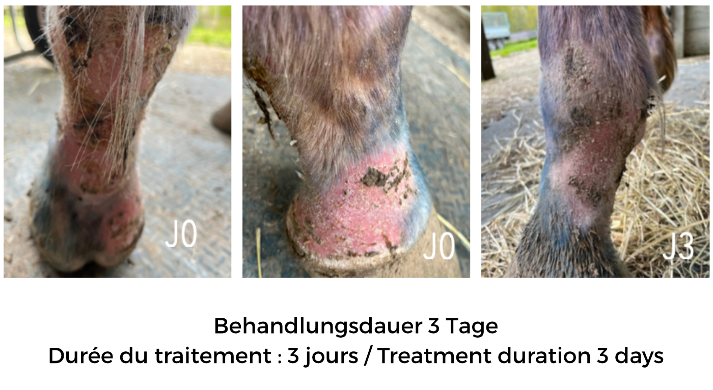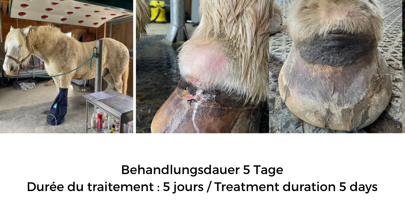 - Nach 5 Tagen Behandlung konnte das Bein wieder belastet werden und das Pferd wies deutlich mehr Komfort auf.
