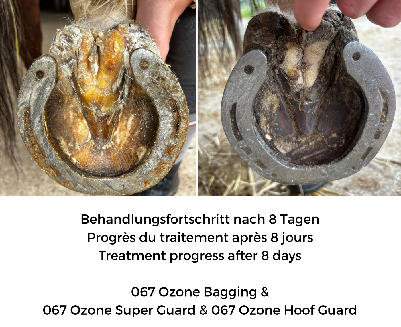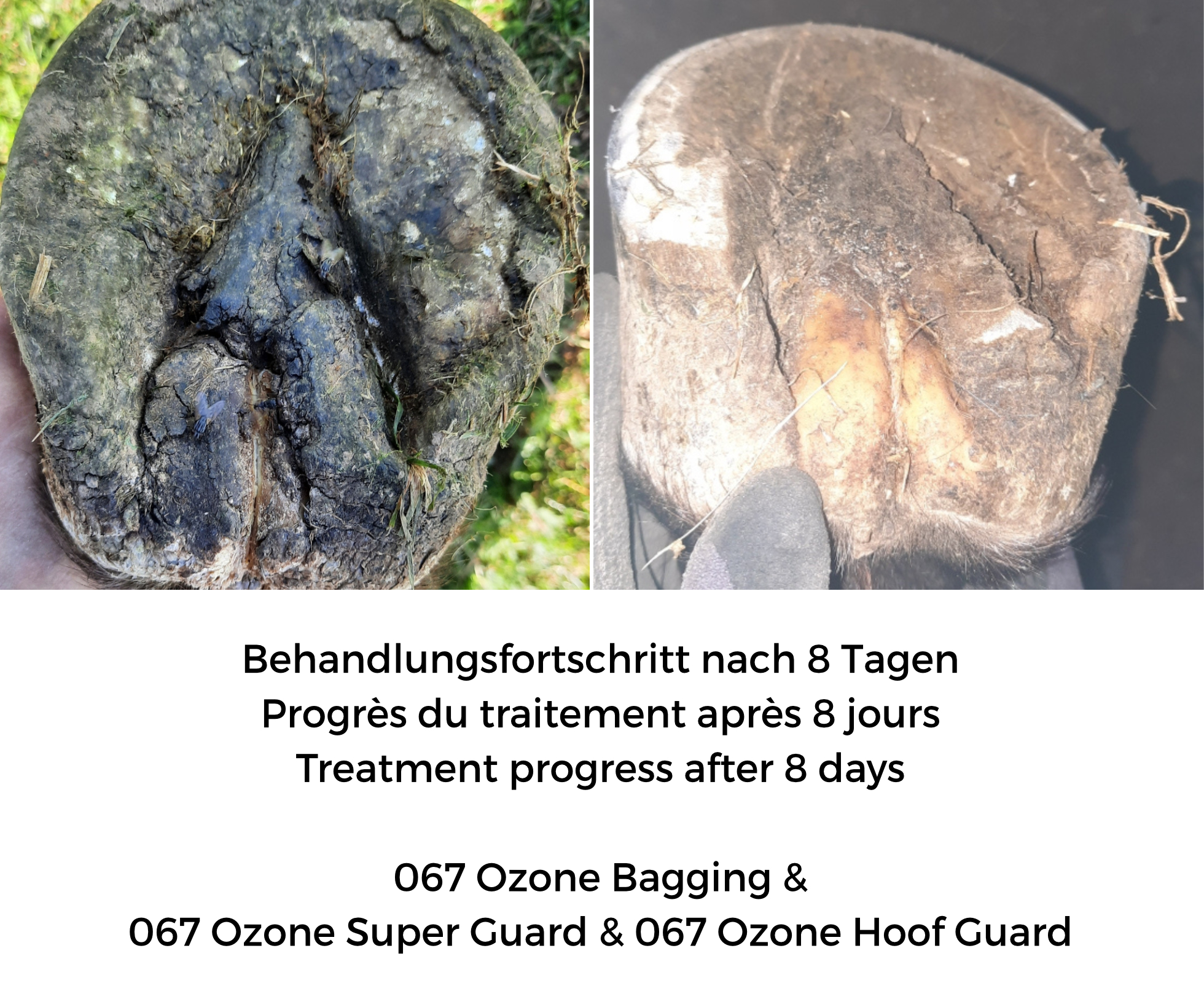 Einige Pferde weisen 18 Monate nach der Behandlung mit Ozon gesunde Hufe, bei anderen sind neu auftretende Schübe weniger schwerwiegend und können dank der Sitzungen mit dem 067 Bagging schnell unter Kontrolle gebracht werden.