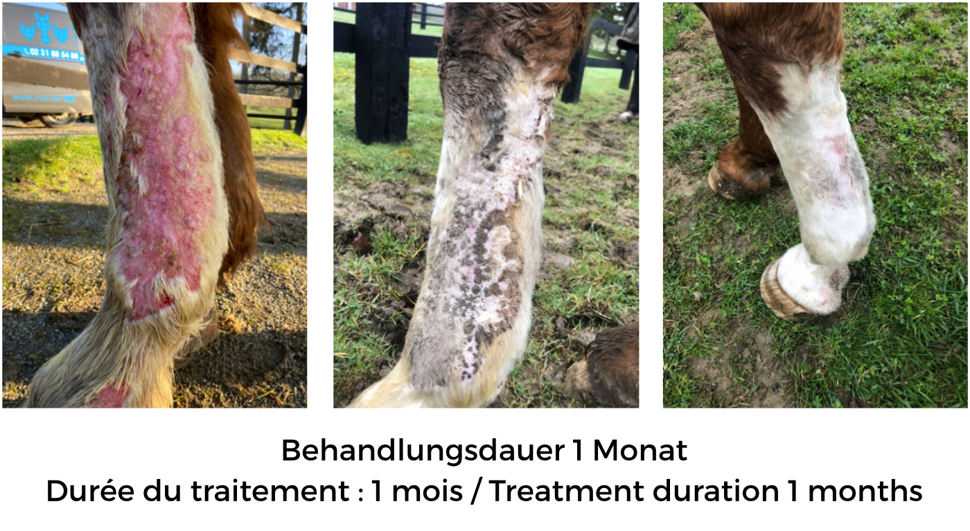 Ein 16-jähriger Araberwallach bekommt jeden Sommer starke Mauke mit Lymphangitis. Im Juli 2024 verschlimmert sich die Hautkrankheit trotz diverser Behandlungsmethoden mit verschiedenen Cremes, Antibiotika und Entzündungshemmern (lokal und oral), es wurden sogar Hautproben entnommen und eine bakteriologische Analyse durchgeführt. Die Hautläsionen waren extrem schmerzhaft und die Entzündung der Gliedmaßen war sehr ausgeprägt.